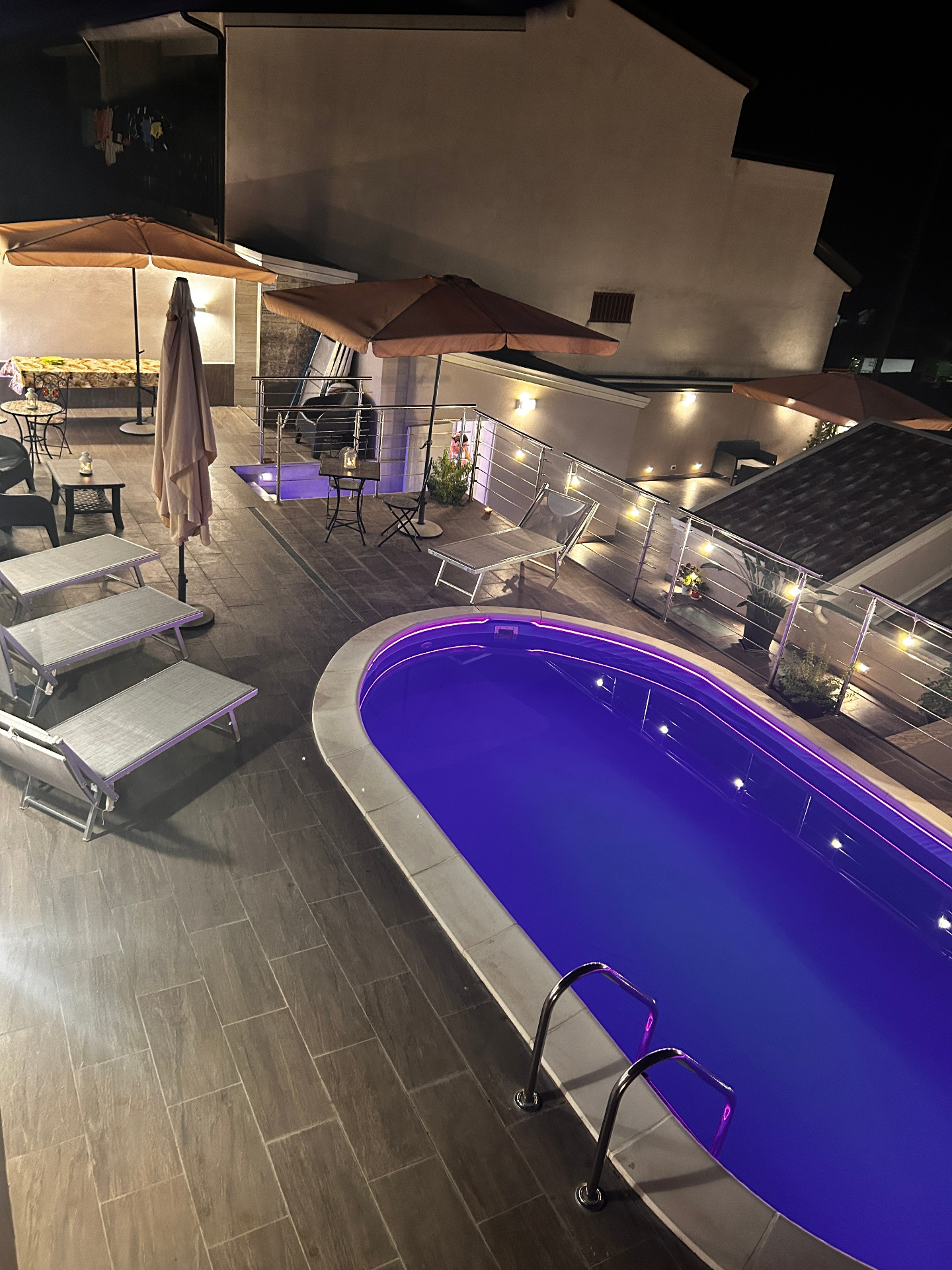 - di SERVIZIO HAPPY HOUR, FESTE e CENE PRIVATE. La struttura può vantare una ampia terrazza, su due livelli, con solarium, piscina, jacuzzi esterna e zona bar, rappresentando una location riservata ed ideale per organizzare Happy Hour, Feste e Cene private indimenticabili per i vostri ospiti